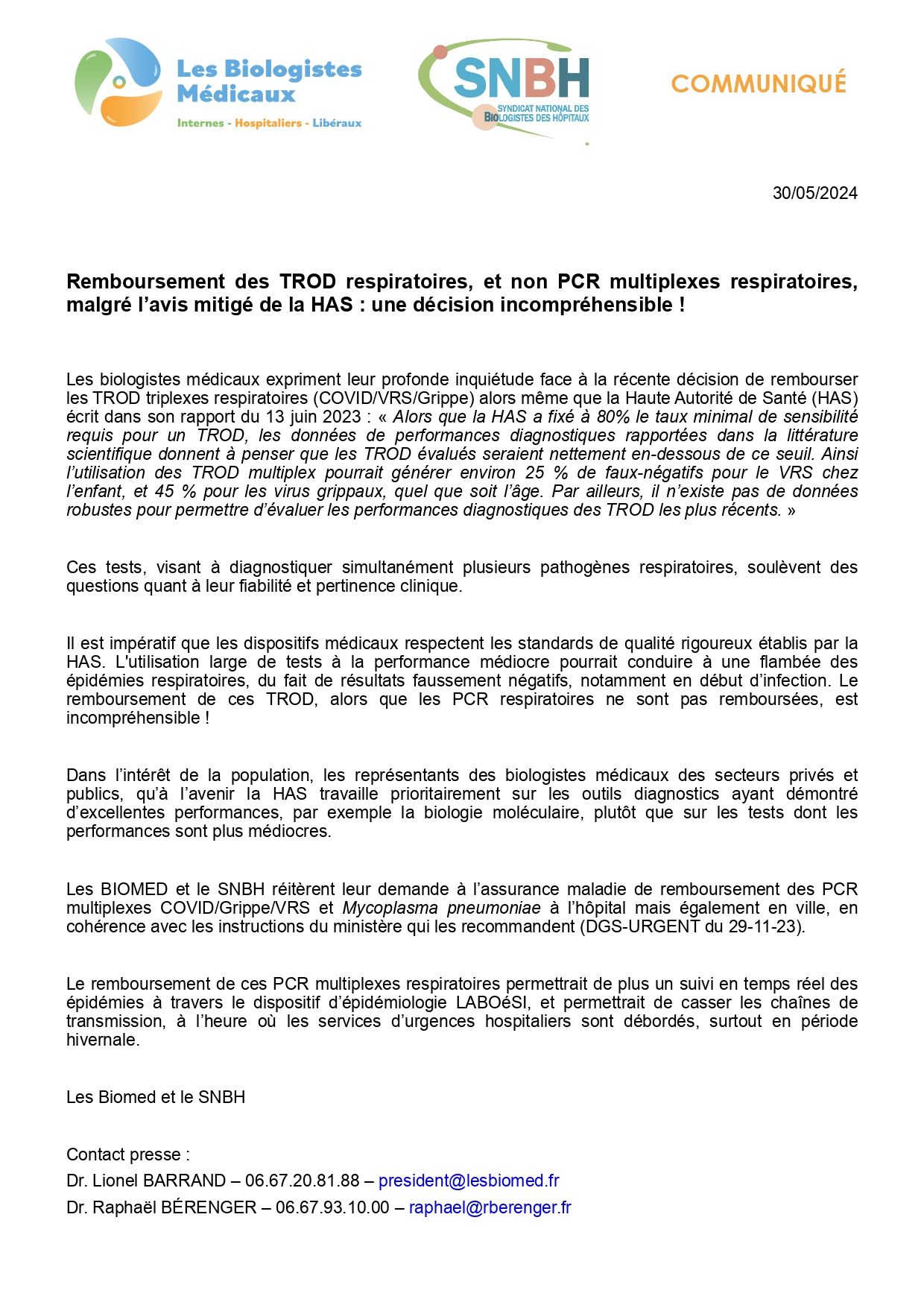 Publié dans Actualités - Communiqués. TROD versus PCR multiplexes respiratoires : le monde à l'envers ! Créé le 30 mai 2024.