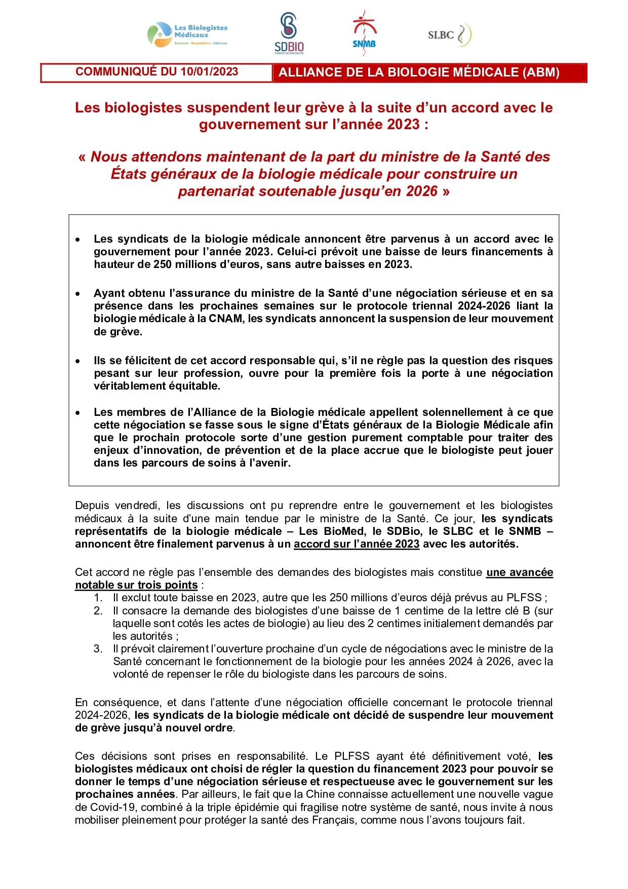 Publié dans Actualités - Communiqués. Communiqué ABM - Les biologistes suspendent leur grève à la suite d’un accord avec le gouvernement sur l’année 2023 Créé le 11 janvier 2023. Précédent Suivant