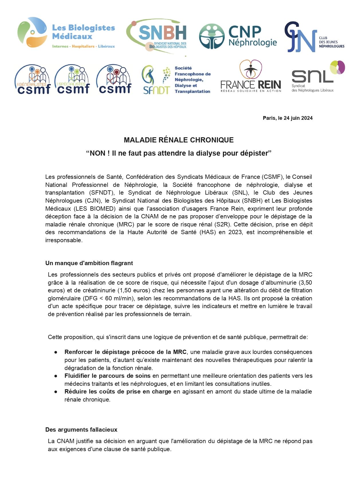 Publié dans Actualités - Communiqués. CDP commun Maladies Rénales Chroniques : “Il ne faut pas attendre la dialyse pour dépister” Créé le 24 juin 2024.