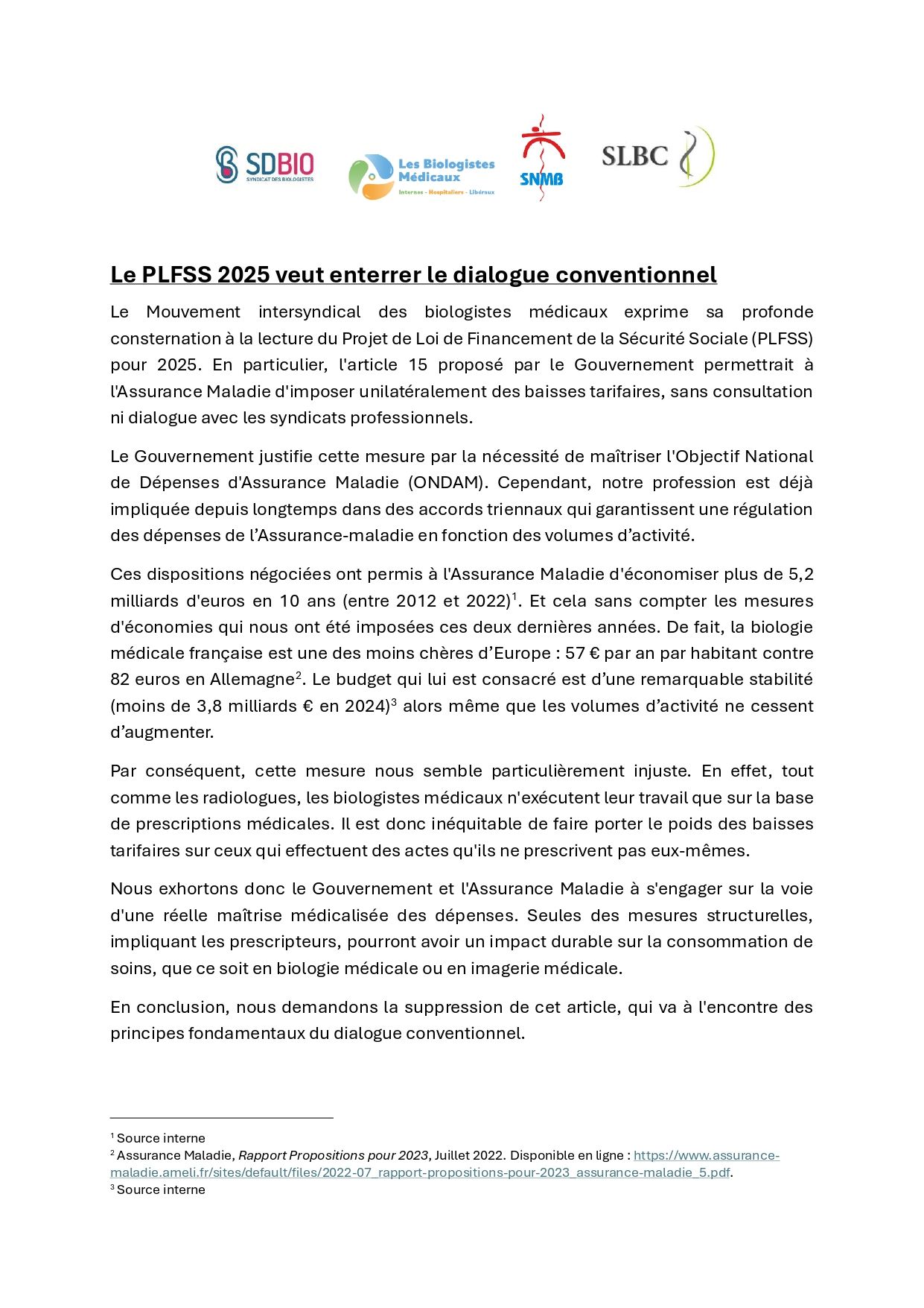 Publié dans Actualités - Communiqués. Communiqué intersyndical : Biologie hospitalière et libérale mises en péril Créé le 19 août 2024.