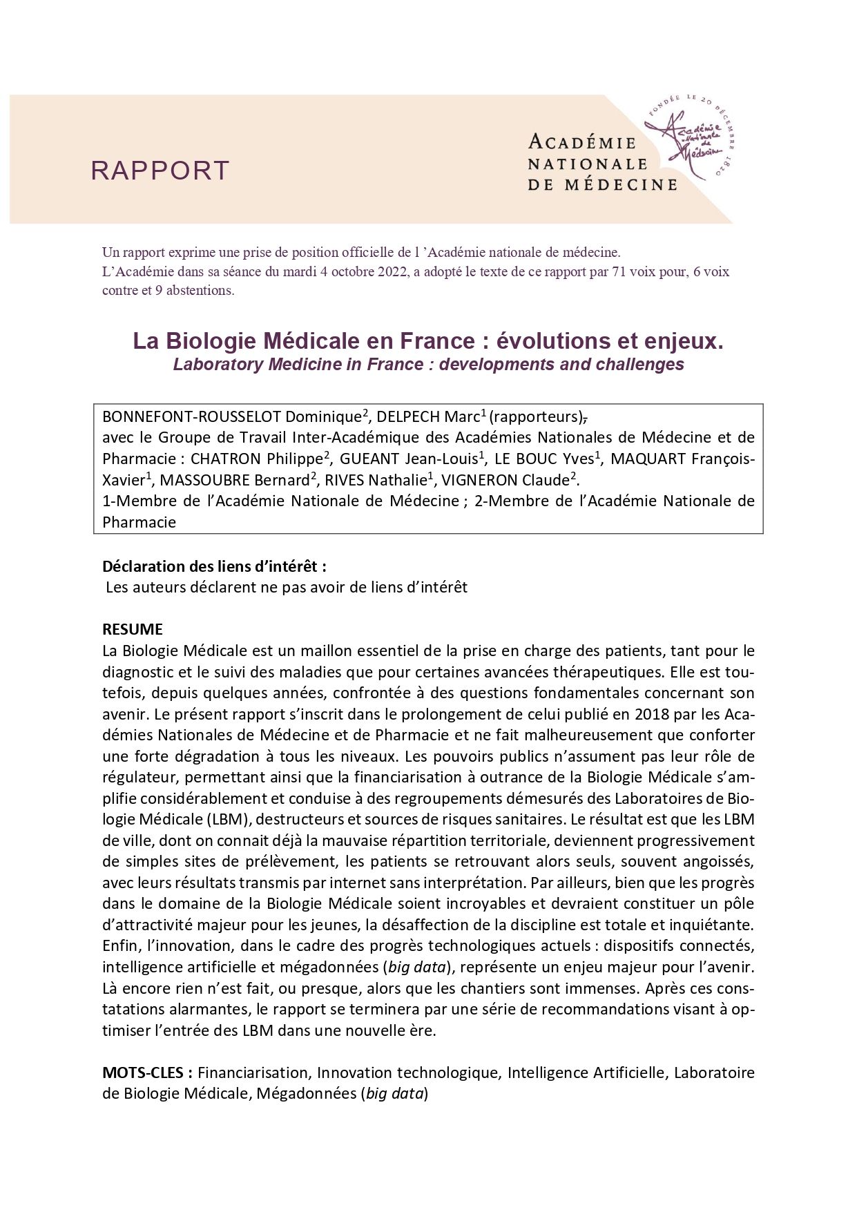 Publié dans Actualités. Rapport avenir de la biologie médicale - Académie Nationale de Médecine Créé le 18 octobre 2022.