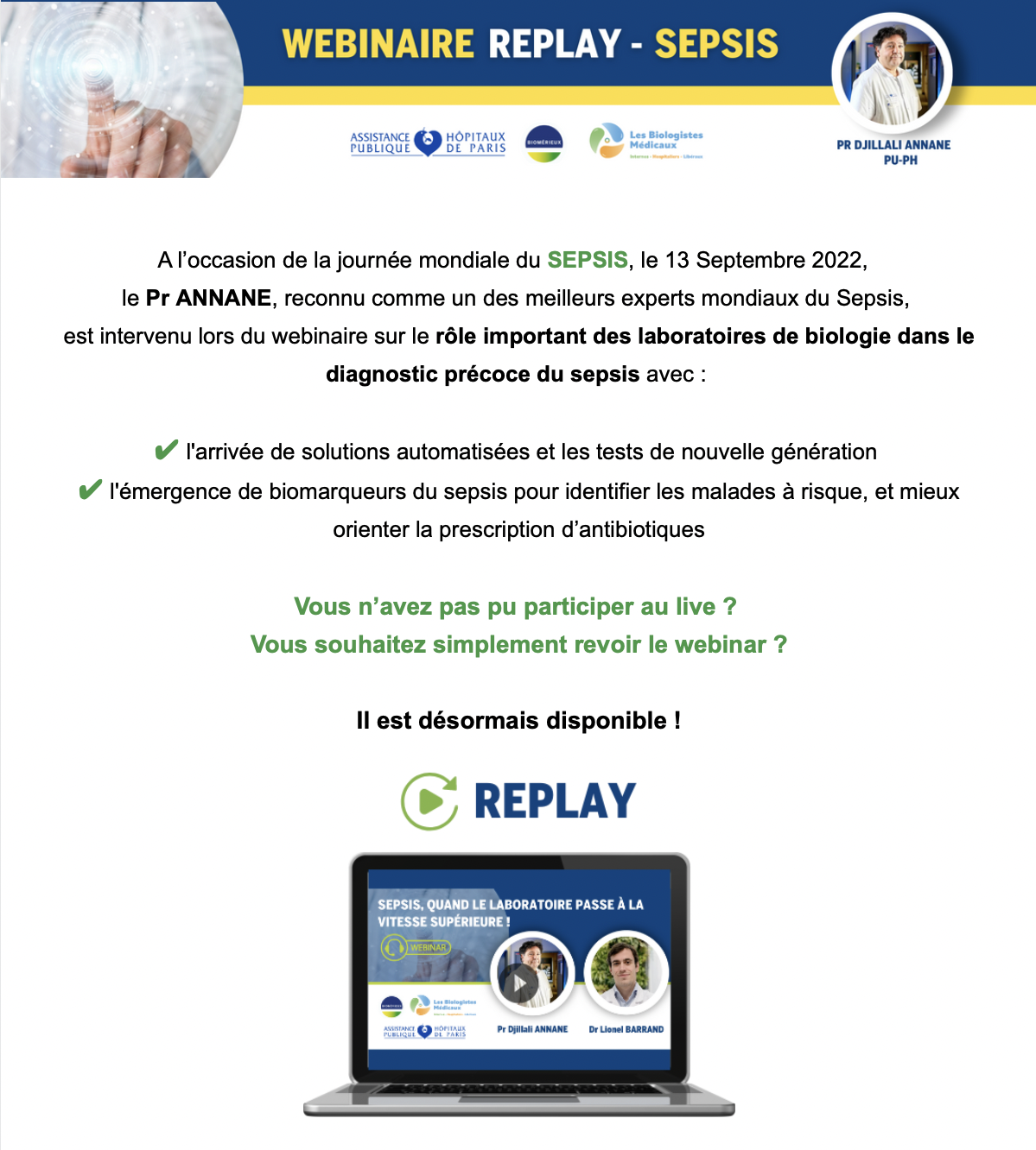 Publié dans Actualités. Replay Webinaire bioMérieux : "Sepsis, quand le laboratoire passe à la vitesse supérieure !" Créé le 19 octobre 2022.