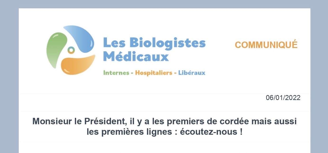 Publié dans Communiqué de Presse. Monsieur le Président, il y a les premiers de cordée mais aussi les premières lignes : écoutez-nous ! Créé le 6 janvier 2022. Précédent Suivant